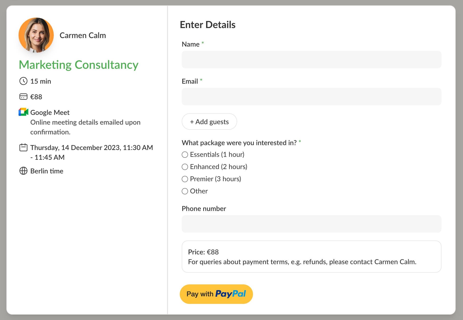Durch die Integration von PayPal mit Zeeg kannst du dich einfach für die Zeit bezahlen lassen, die du den Teilnehmern anbietest. Zeeg akzeptiert PayPal-Zahlungen für alle Arten von Terminplanungsseiten.