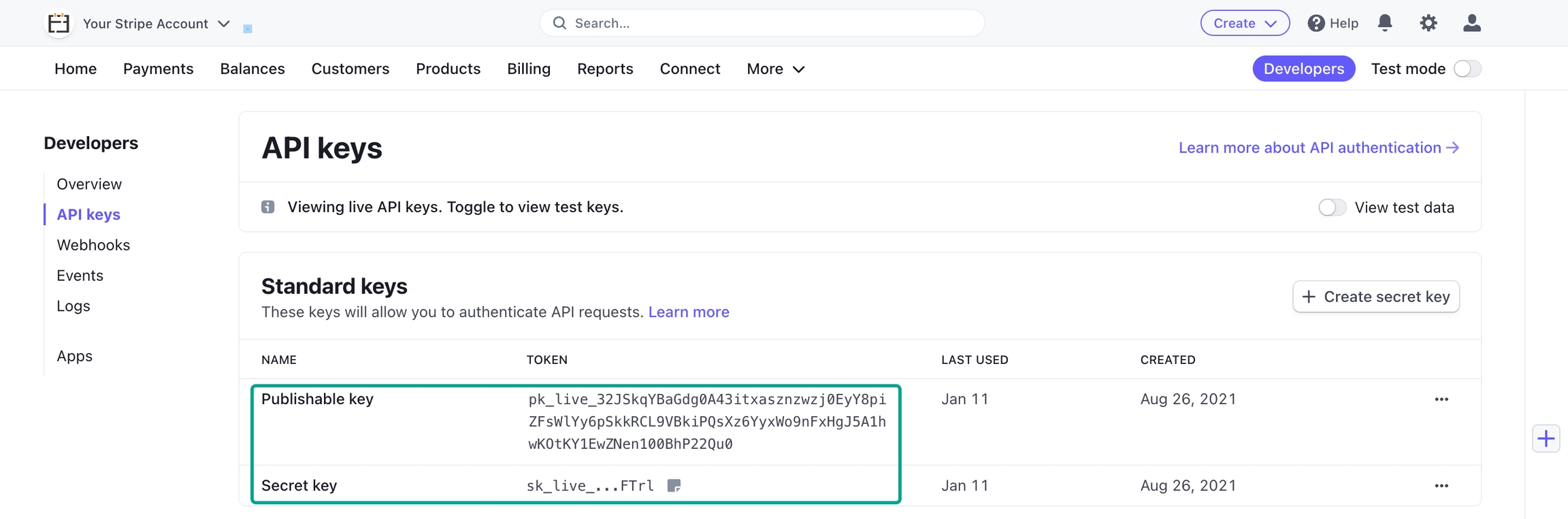 Kopiere den Öffentlichen Schlüssel und den Geheimen Schlüssel deines Stripe-Kontos von hier.