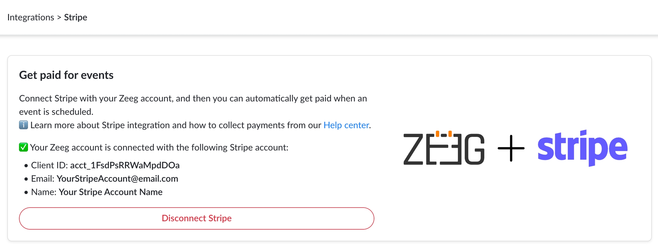 Durch die Integration von Stripe mit Zeeg kannst du dich einfach für die Zeit bezahlen lassen, die du den Teilnehmern anbietest. Zeeg akzeptiert Kredit- oder Debitkartenzahlungen für deine Einzeltermine, Gruppentermine und kollektiven Termine.